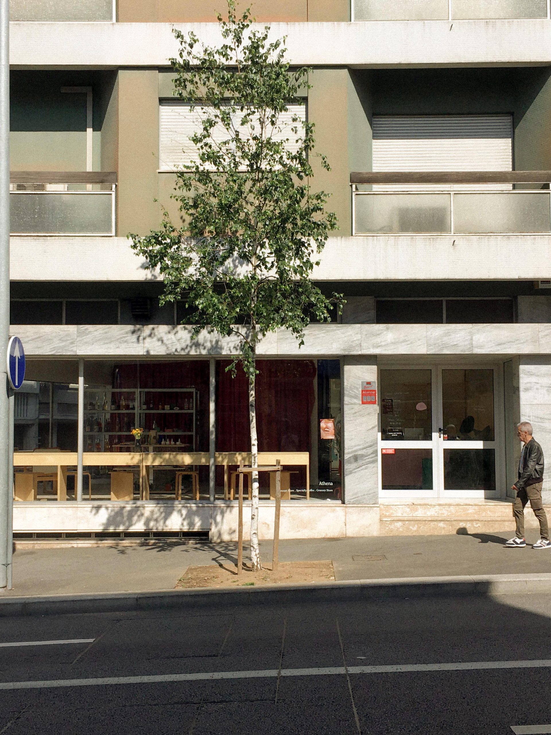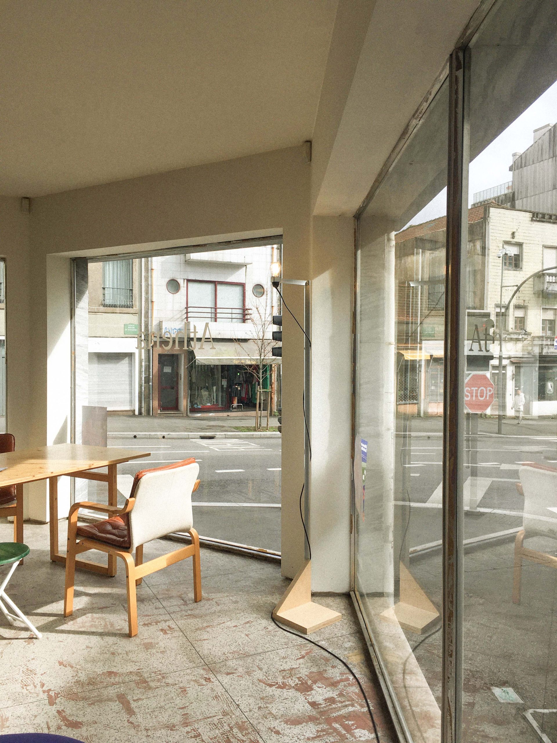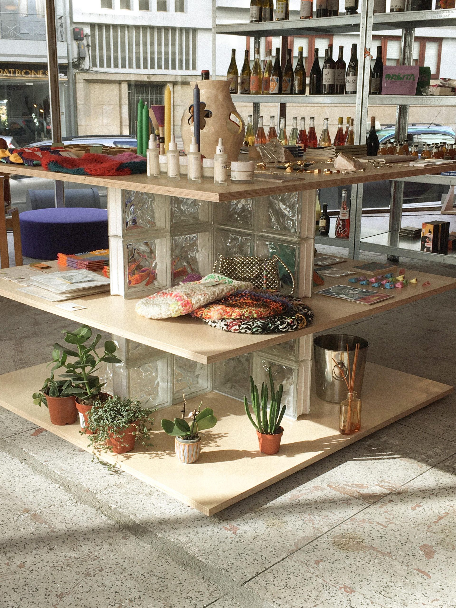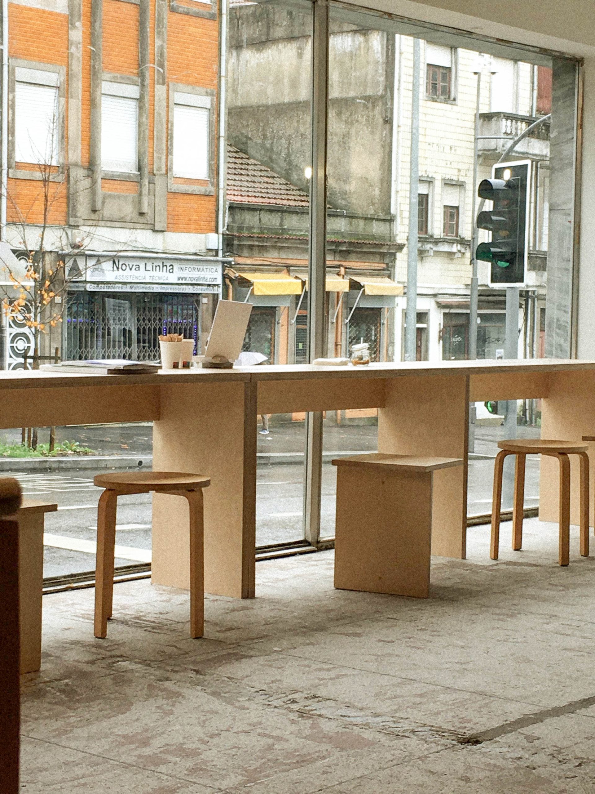 Um espaço montra situado numa das avenidas mais movimentadas da cidade, local de passagem, sem referências, tão característico que é confundido como banal. O objectivo era criar uma intervenção temporária, com grande economia de meios, que juntasse espaço de loja e espaço de cafeteria. A intervenção foi desenvolvida tendo como ponto de partida elementos leves e amovíveis, desenvolveram-se diferente superfícies que configuram espaços de refeição, de exposição e de transição. Utilizam-se materiais standard, como placas de contraplacado de bétula, policarbonato, blocos de vidro e outras unidades de mobiliário standard, num hibrido de projecto de arquitectura e curadoria de design, que visa tentar constituir um lugar, no rés do chão de um dos milhares de gavetos que existem pela cidade.
